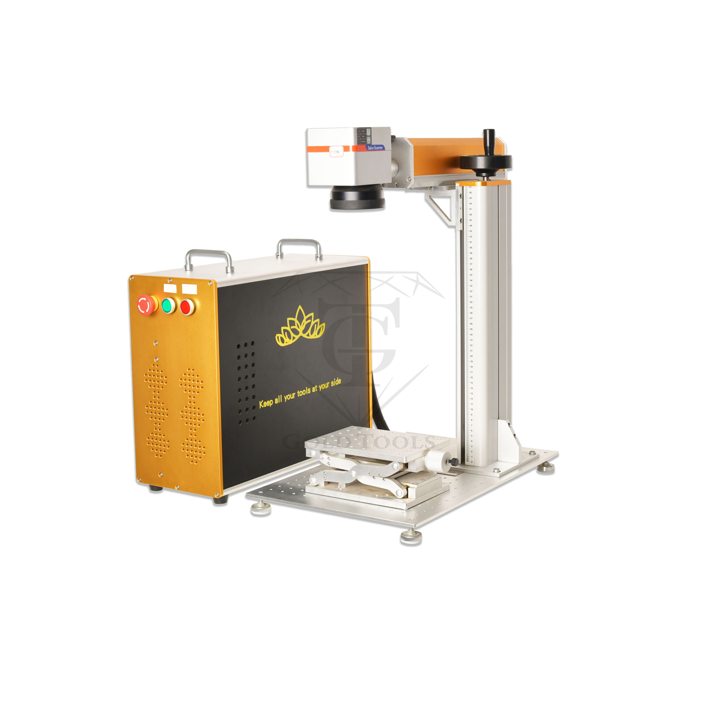 Cette machine laser Gold Tools est conçue pour la personnalisation rapide et détaillée des bijoux. Elle comprend une source laser puissante, une colonne de réglage graduée avec scanner Galvo et un plateau de travail ajustable, permettant de réaliser des gravures nettes et durables avec une grande répétabilité.